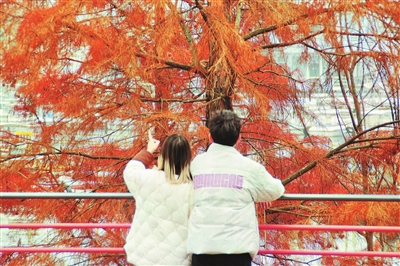 行至绿道拐弯处,两侧水杉天然形成绝美画框,游人入内便成暖色童话主角,被热烈色彩温柔环抱。听杉叶沙沙作响,闻湖风送来清冽草木香,这株株“活化石”,正以一身绚烂,将仙海寒冬酿成温暖童话。