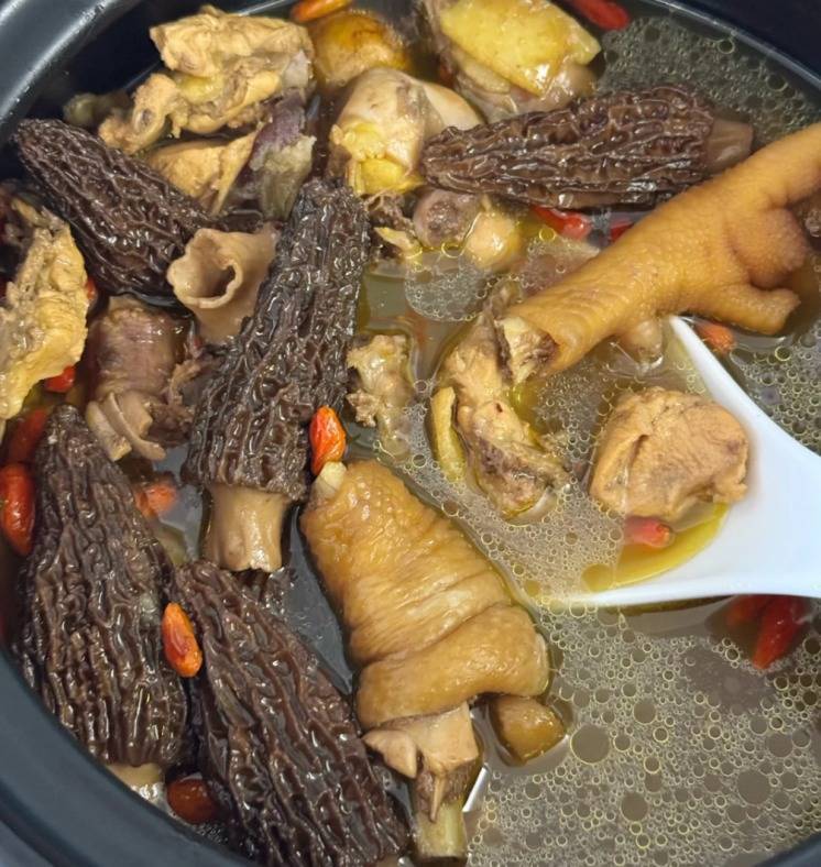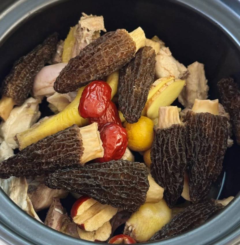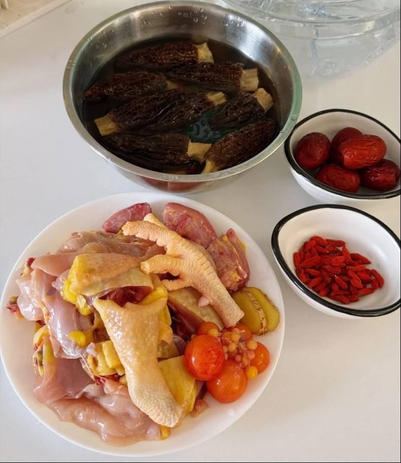 食材清单:半只新鲜的老母鸡(老母鸡要挑脚细皮黄、鸡冠红润的走地鸡,1.5公斤左右最合适,肉质紧实不柴,老母鸡是用来煲汤的首选,我们家一般是半只用来炖汤,喝起来鲜美极了),羊肚菌少许(羊肚菌选伞盖完整、菌柄粗壮的干货,30克刚好够四口之家,用前得用温水泡发半小时),清水和纯净水足量,几个红枣或灰枣,老姜一大块,小葱或大葱少许,食盐和胡椒粉少许。