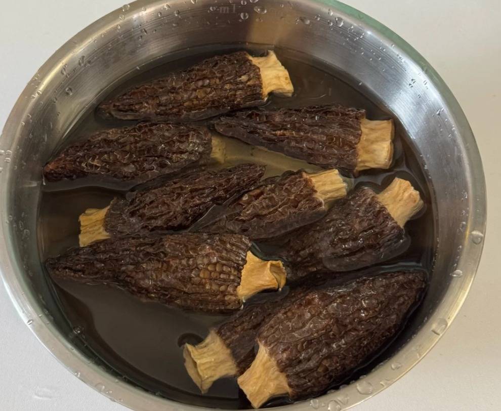 3:羊肚菌要用温水泡发,水要没过菌菇,泡发半个小时,去掉根部一圈,去掉表面的泥沙,洗菌菇的水可以不倒掉,沉淀后还有用处。